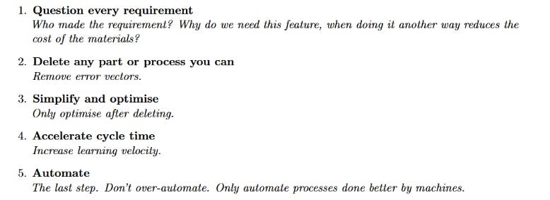 The algorithm Elon Musk developed when building Tesla provides the framework: